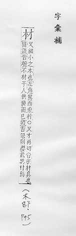 木料,泛指一切原料或资料:~料。教(jiào )~。素~。题~。就地取~。 能力,资质:~干(gàn )。大~小用。因~施教(jiào)。 棺木:寿~。