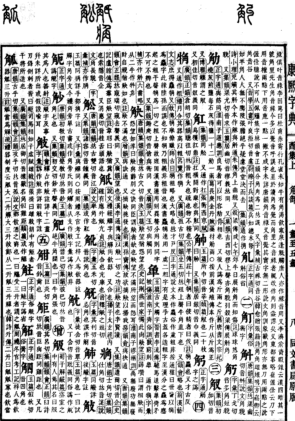 《唐韵》古乎切《集韵》《韵会》《正韵》攻乎切,𠀤音孤。《说文》鄕飮酒之爵也。一曰觞受三升者谓之觚。《周礼·冬官考工记》梓人为飮器,觚三升。《注》觚,当为觯。《疏》礼器制度云:觚大二升,觯大三升。故郑从二升觚,三升觯也。《韩诗外传》二升曰觚。觚,寡也。飮当寡少。《论语》觚不觚。《疏》觚者,礼器,盛酒二升。 又方也。《周礼·天官·小宰疏》兵书有谲觚之人,谓谲诈桀出,觚角非常也。《史记·酷吏传》汉兴,破觚为圜。《庄子·大宗师》与乎其觚而不坚也。《注》所守方而不固执也。 又法也。《扬子·太𤣥经》占之以其觚。《注》占之以法,谓经纬之休咎也。 又角也。《前汉·律历志》其算法用竹,径一分长六寸二百七十一枚而成六觚,为一握。《苏林曰》六觚,六角也。又《郊祀志》八觚宣通,象八方。《师古曰》觚,角也。《服虔曰》八觚,如今社坛也。 又灶额也。《困学纪闻》仲尼读春秋,老耼据灶觚而听。 又劒拊也。《新论·思愼篇》令提劒锋而掉劒觚,必刎其指,而不能以陷腐木。 又官名。《魏志·东夷倭人传》伊都国官曰尔支,副曰泄谟觚、柄渠觚。又奴国官曰兕马觚。 又人名。《北史·魏献明皇后传》后少子秦王觚。 又觚竹城,在辽西。《尔雅·释地》觚竹、北戸、西王母、日下,谓之四荒。《注》觚竹在北。 又鹑觚,县名。见《晋书·地理志》唐更名灵台,属泾州。《前汉书》作鹑孤。 又通作柧。《班固·西都赋》上觚棱而栖金爵。《注》觚,八觚有隅者也。一曰堂殿上最高转角处。《后汉书》作柧棱。 又通作䉉。《陆机·文赋》或操觚以率尔。《注》觚,木之方者,古人用之以书,犹今之𥳑也。《韵会》竹𥳑也。与䉉通。 又通作菰。《前汉·司马相如·子虚赋》莲藕觚卢。《张晏曰》觚卢,扈鲁也。《史记》作菰芦。《说文》本作苽。